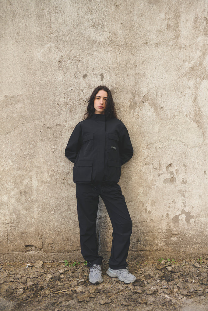 Sporty pants with elastic waist and adjustable string by the foot.