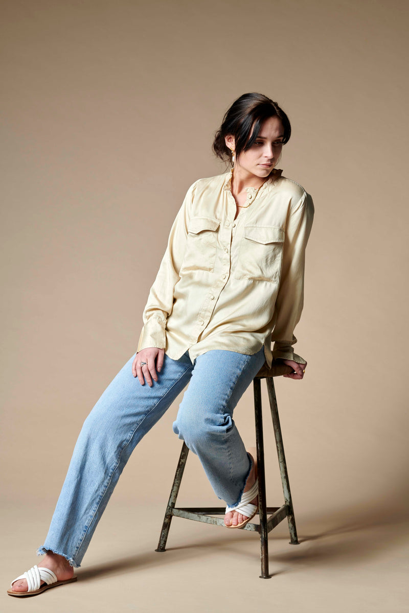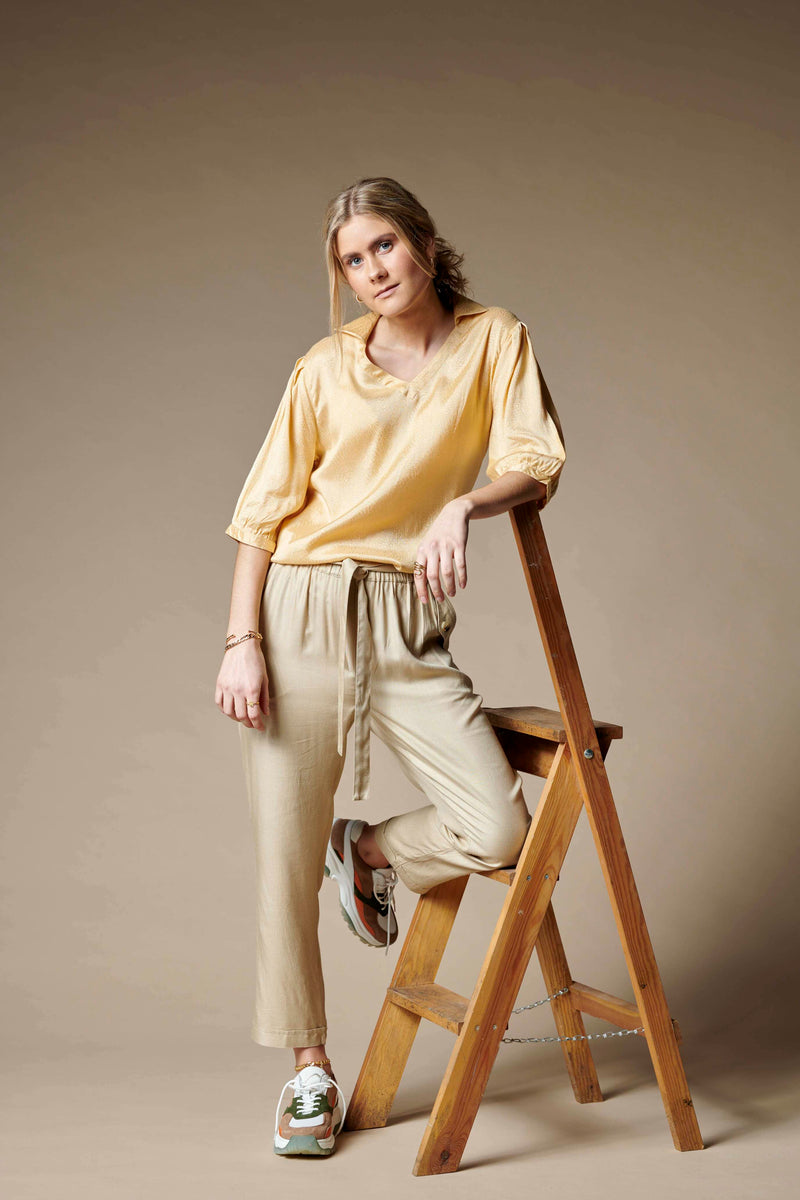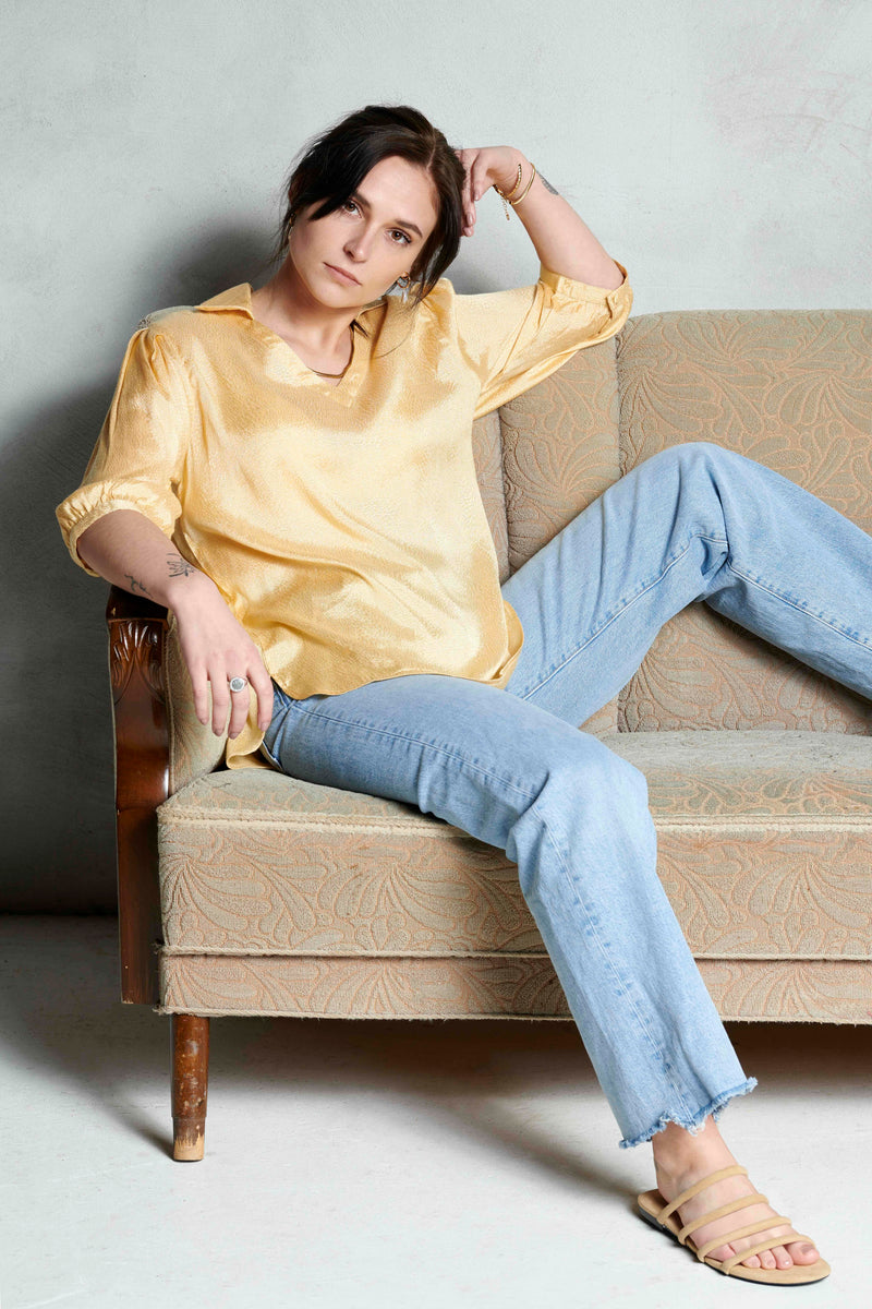 The collection is featuring a color palette mixed by warm tones of brown, pastel yellow, off-white and white. Casual pieces are perfectly supported by feminine flounces & defined shoulders, touched up by a humble touch of rawness.